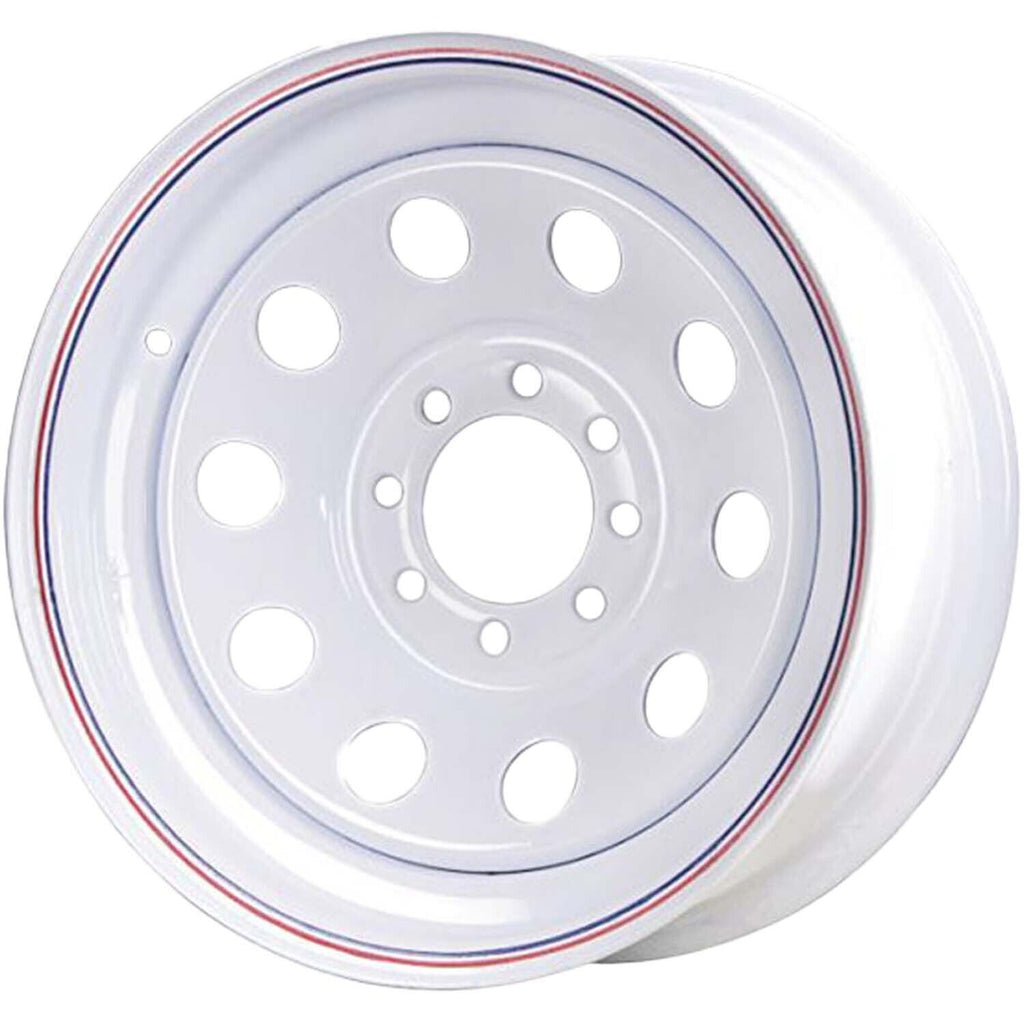 16x6 white with red & blue pin stripes modular steel trailer wheel with a 8 on 6.5 bolt pattern and a load capacity of 3960 lbs.