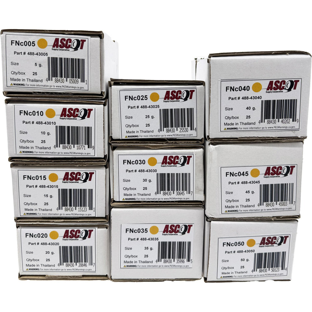 Ascot FN style coated lead wheel weight bundle for most Japanese vehicles equipped with alloy wheels has a special dry polymer coating that prevents the wheel from being stained by the weight.