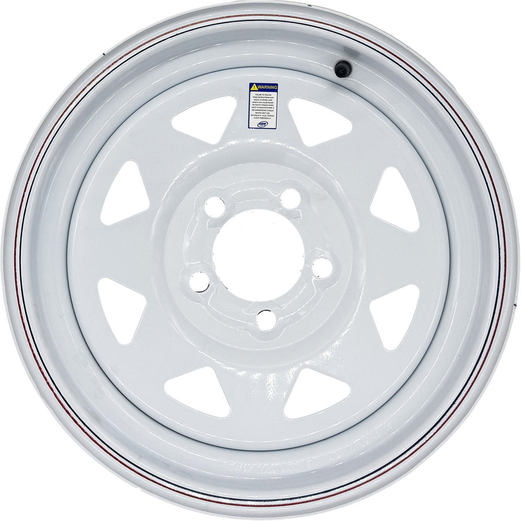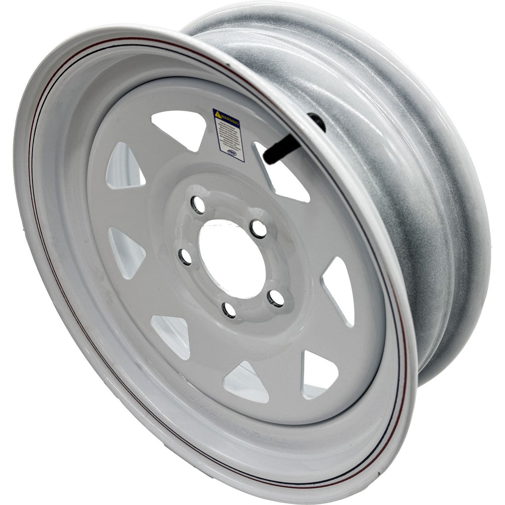 15x5 white with red & blue pin stripes spoked steel trailer with a 5 on 5.5 bolt pattern and 2160 load capacity.