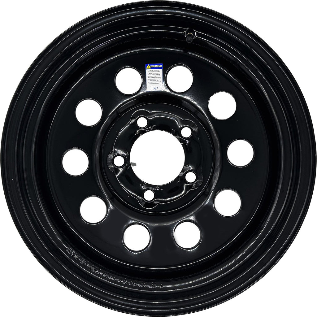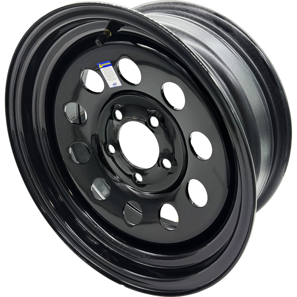 15x6 black modular steel trailer wheel with a 5 on 4.5 bolt pattern and a load capacity of 2860 lbs.