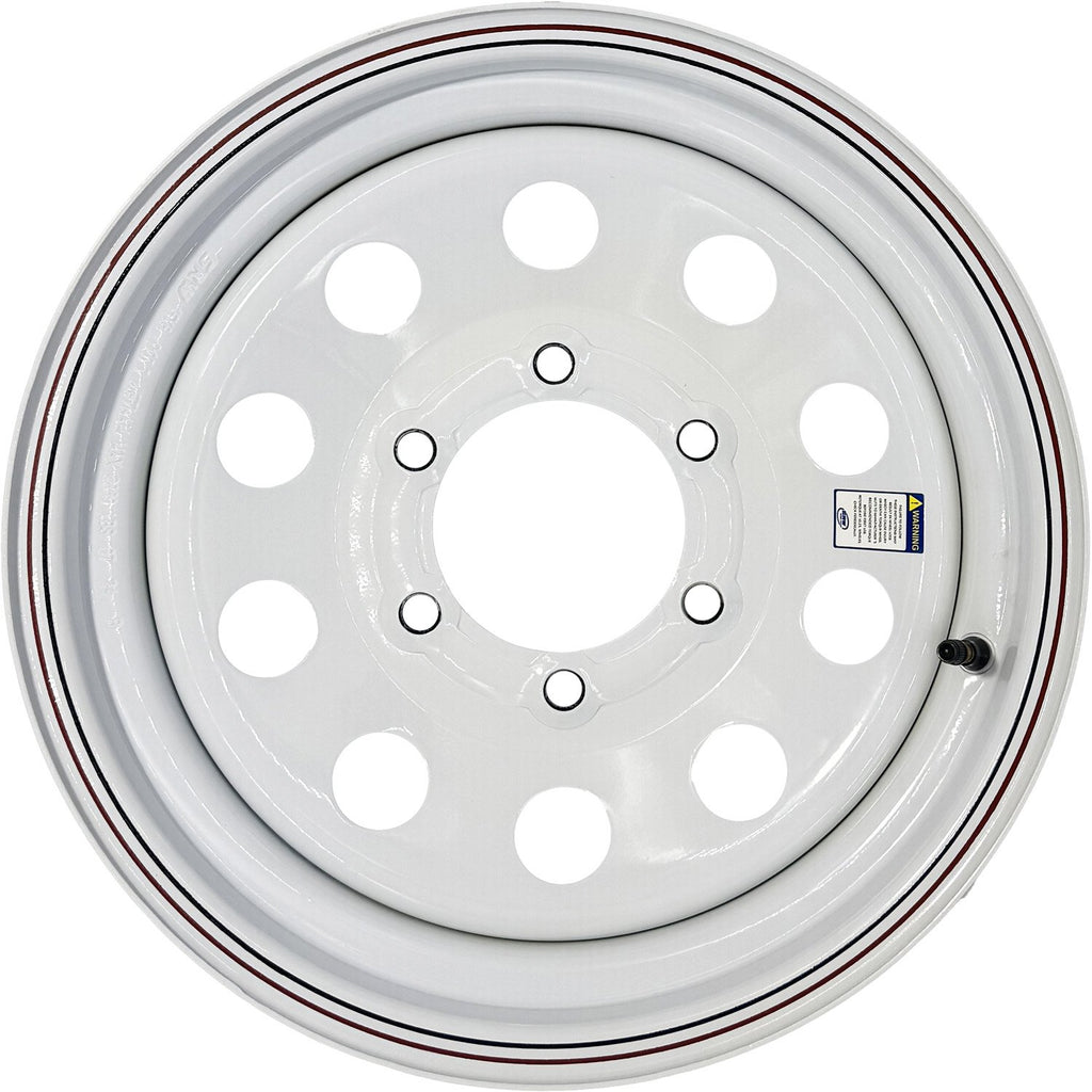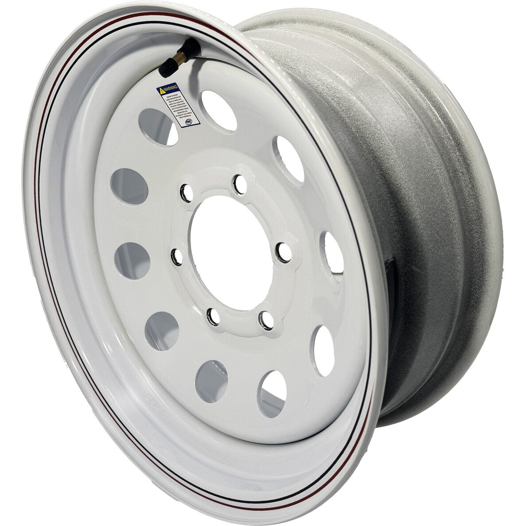 15x6 white with red & blue pin stripes modular steel trailer wheel with a 6 on 5.5 bolt pattern and a load capacity of 2860 lbs.