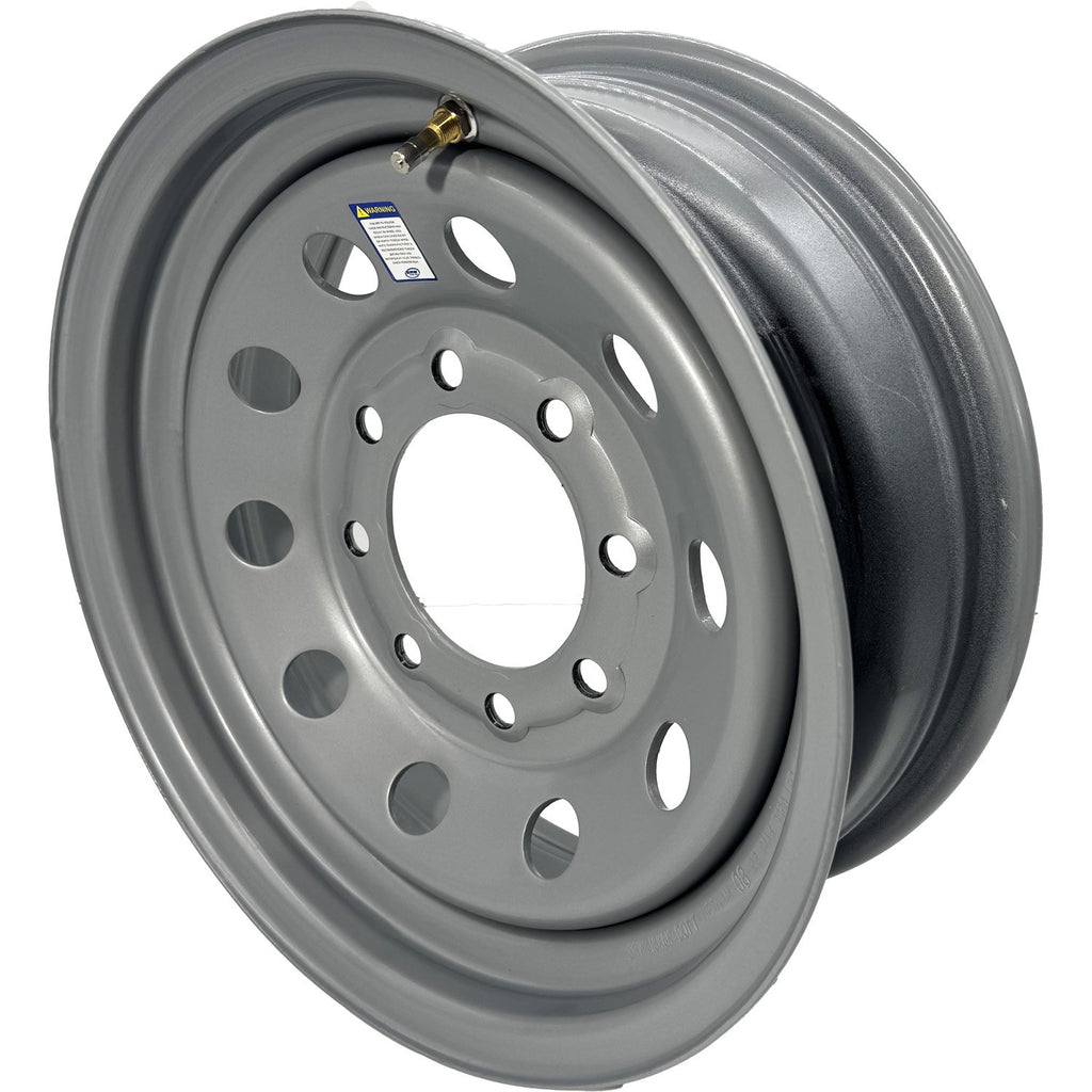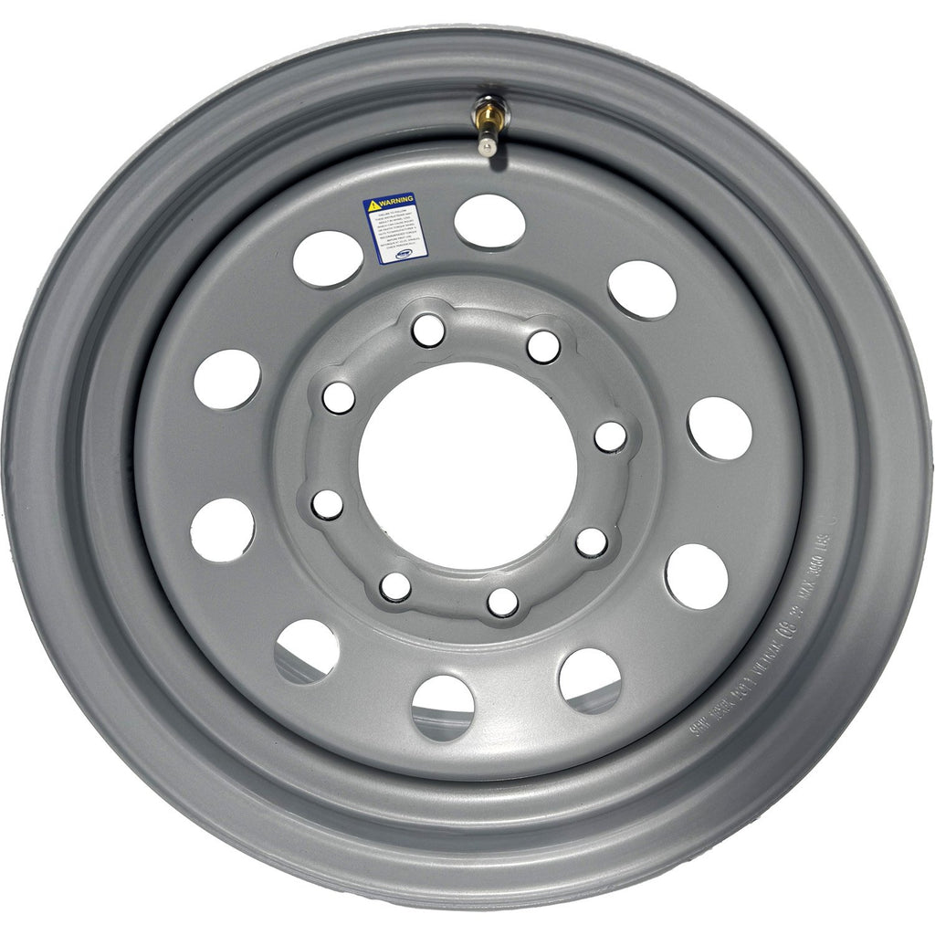 16x6 silver modular steel trailer wheel with a 8 on 6.5 bolt pattern and a load capacity of 3960 lbs.