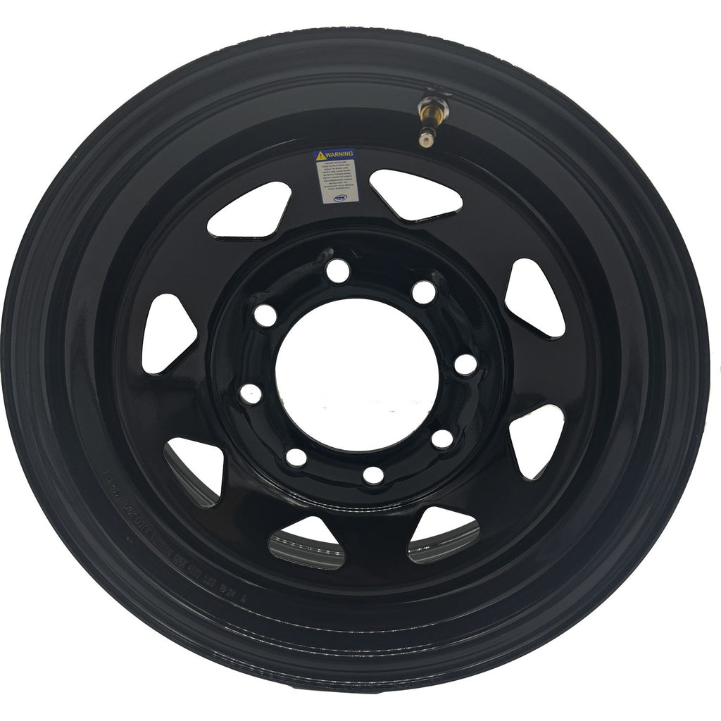 16x6 black spoked steel trailer wheel with a 8 on 6.5 bolt pattern and a load capacity of 3960 lbs.
